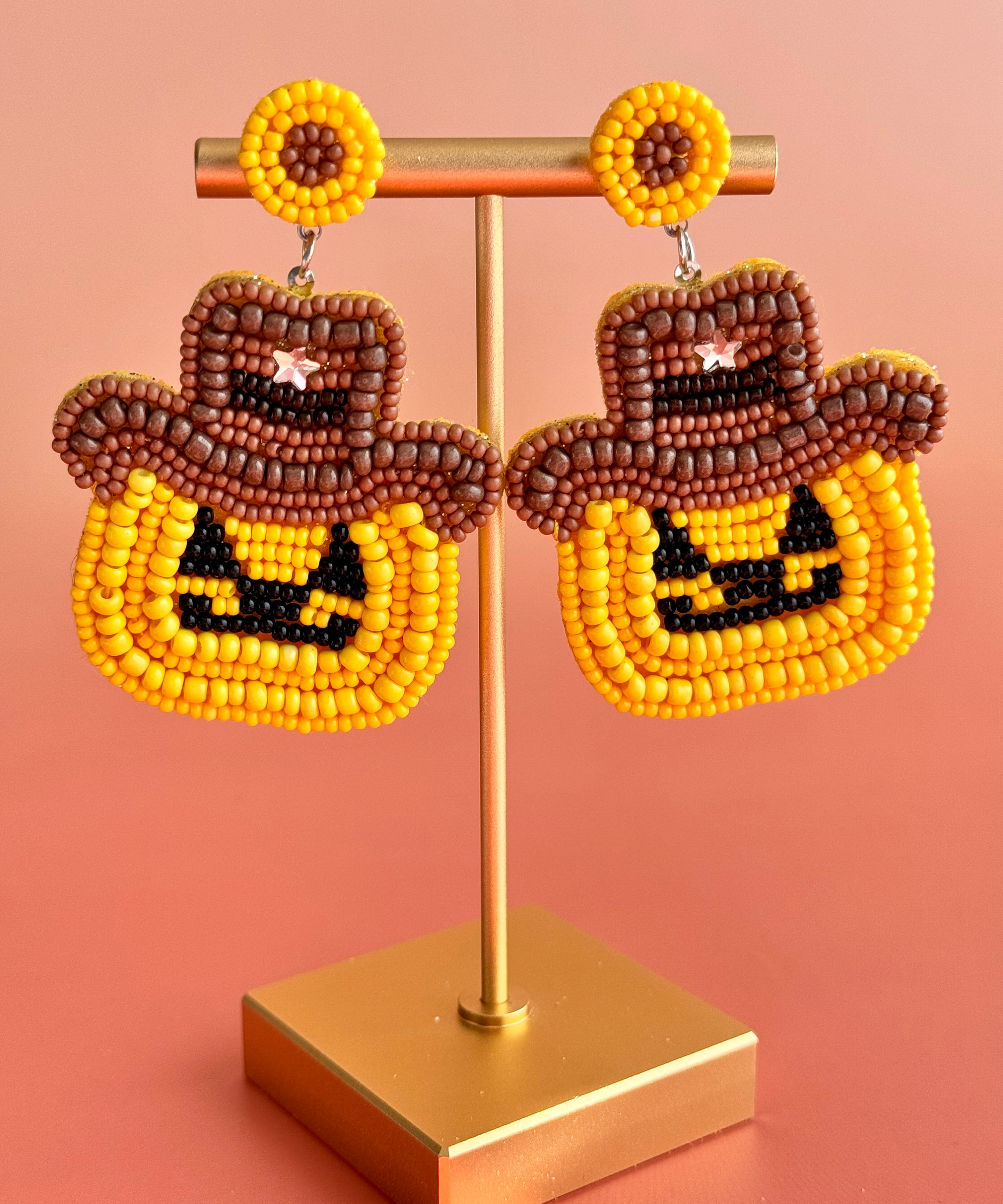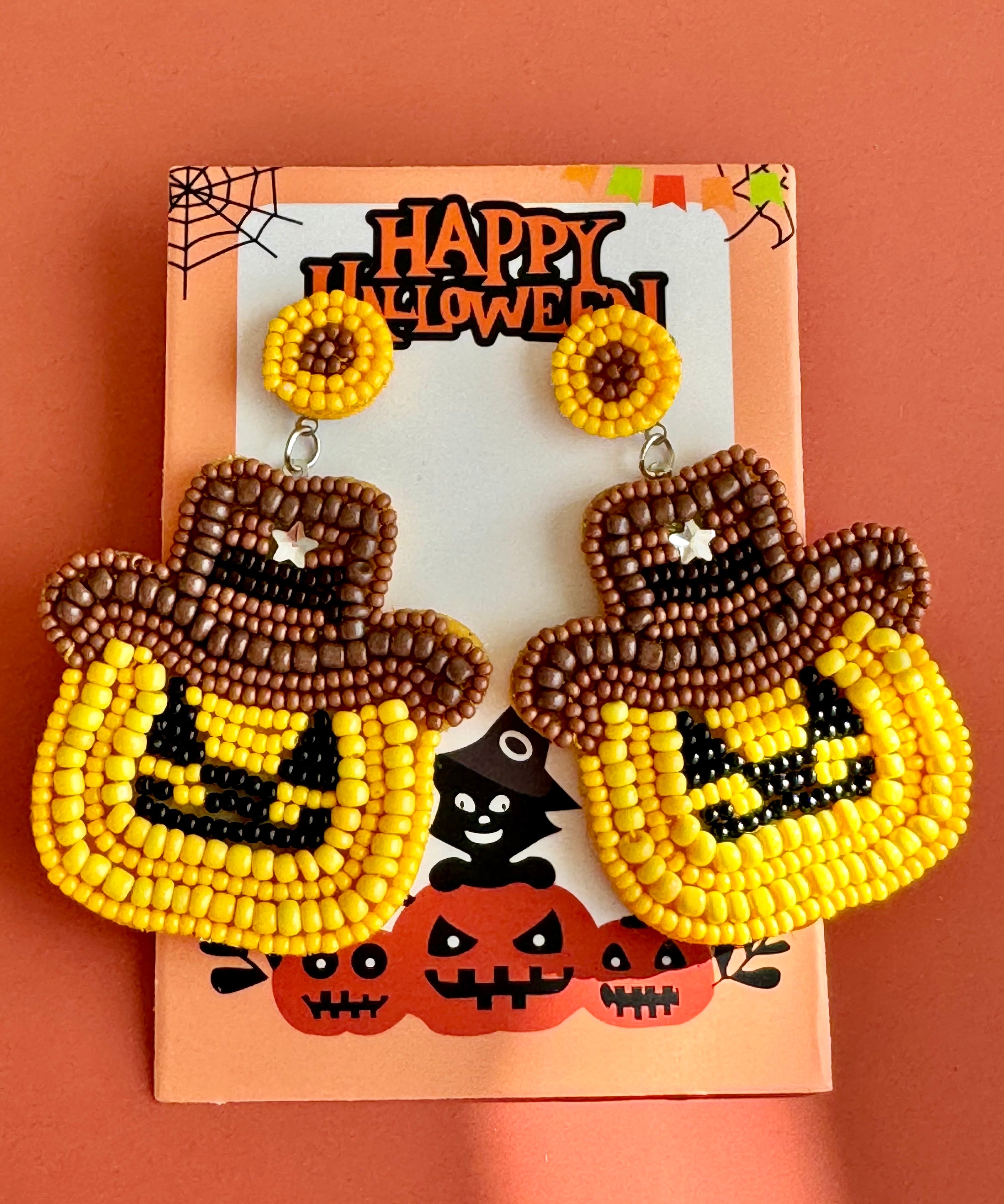 Handmade Halloween Seed Bead Earrings: Cowboy Ghost Pumpkin Dangle