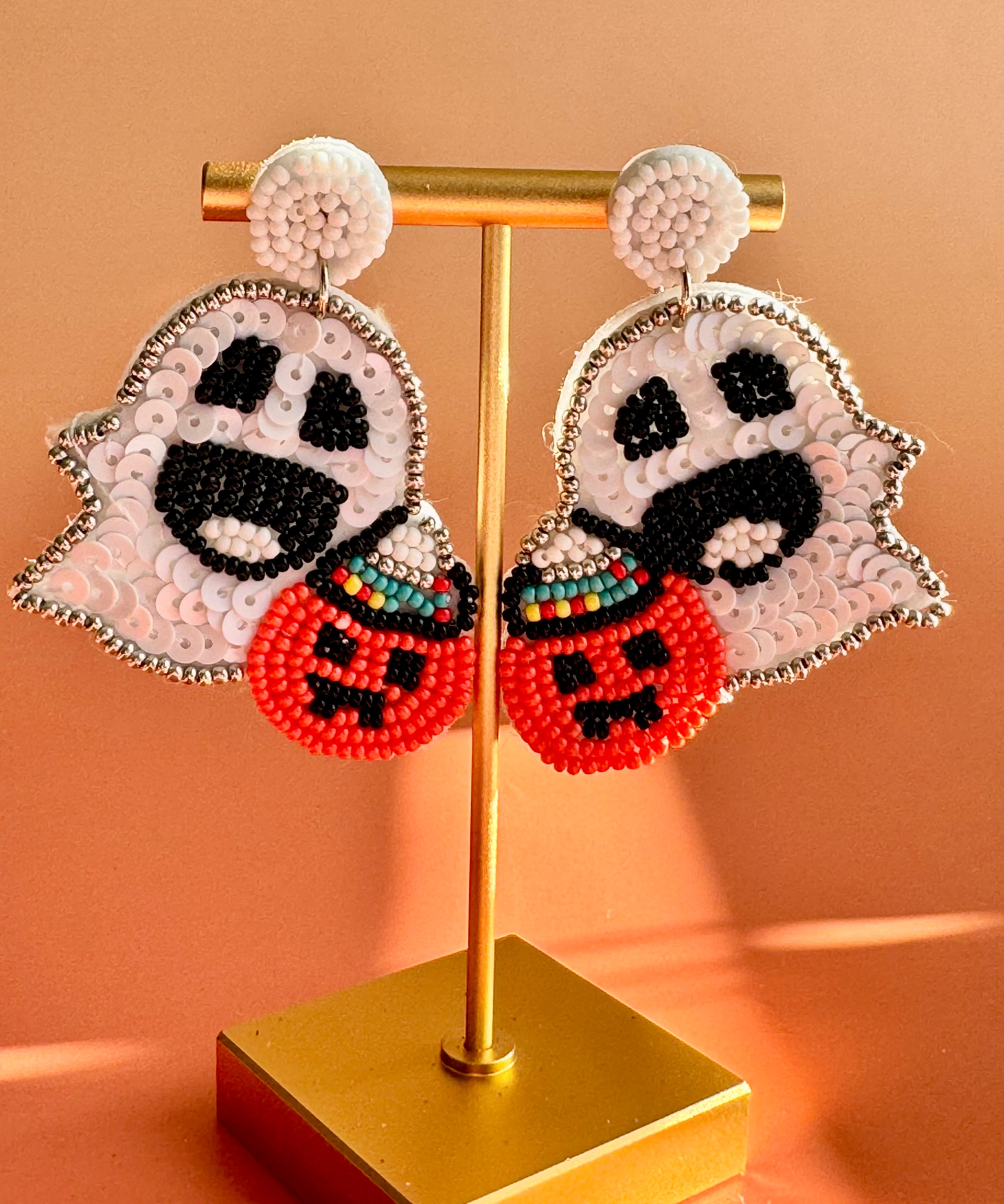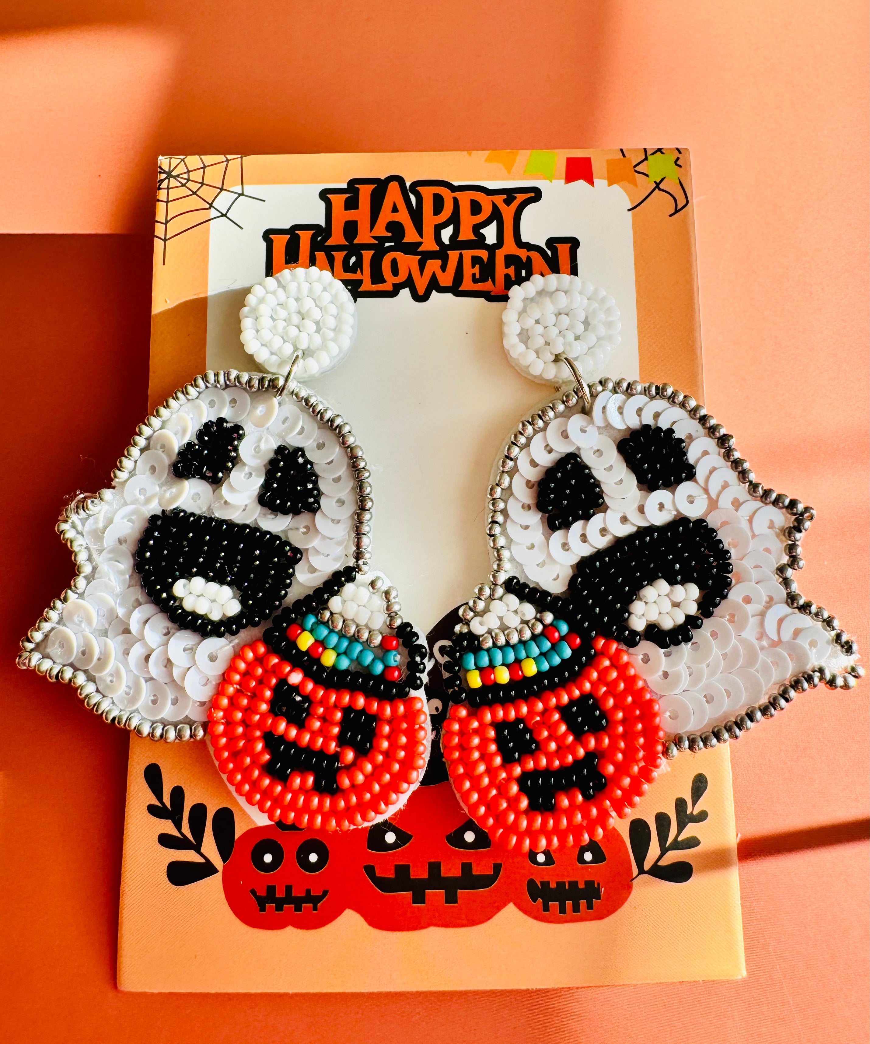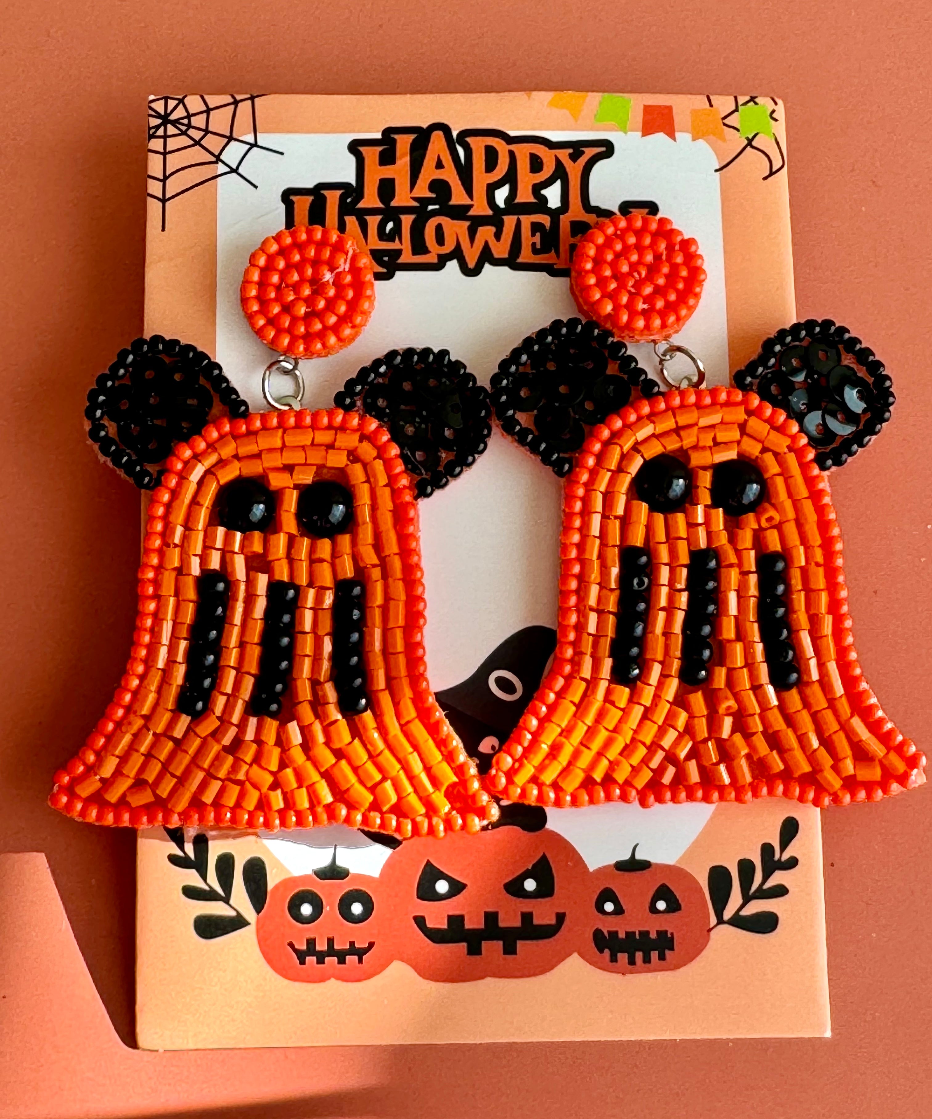 Handmade Halloween Ghost & Pumpkin Seed Bead Earrings