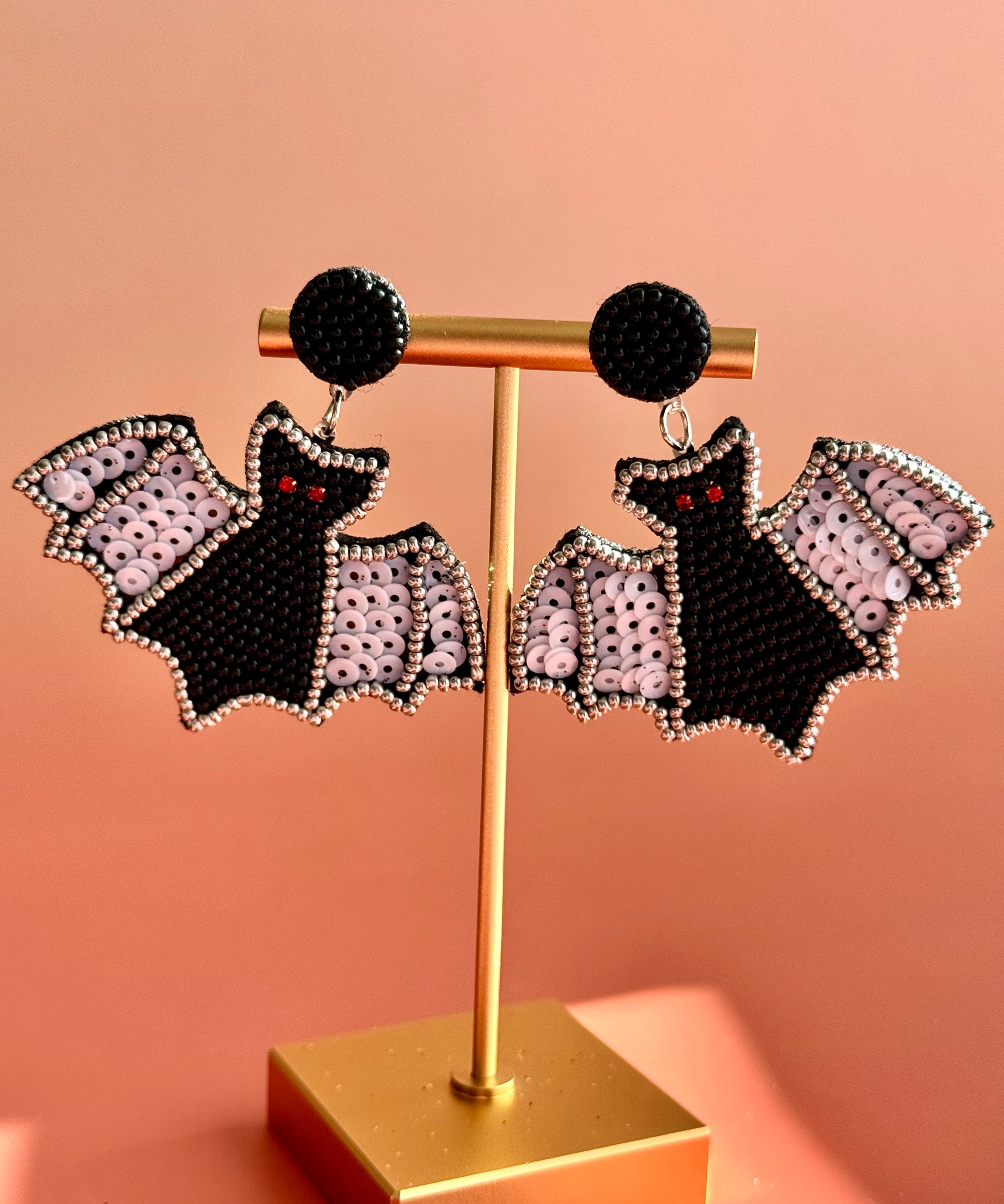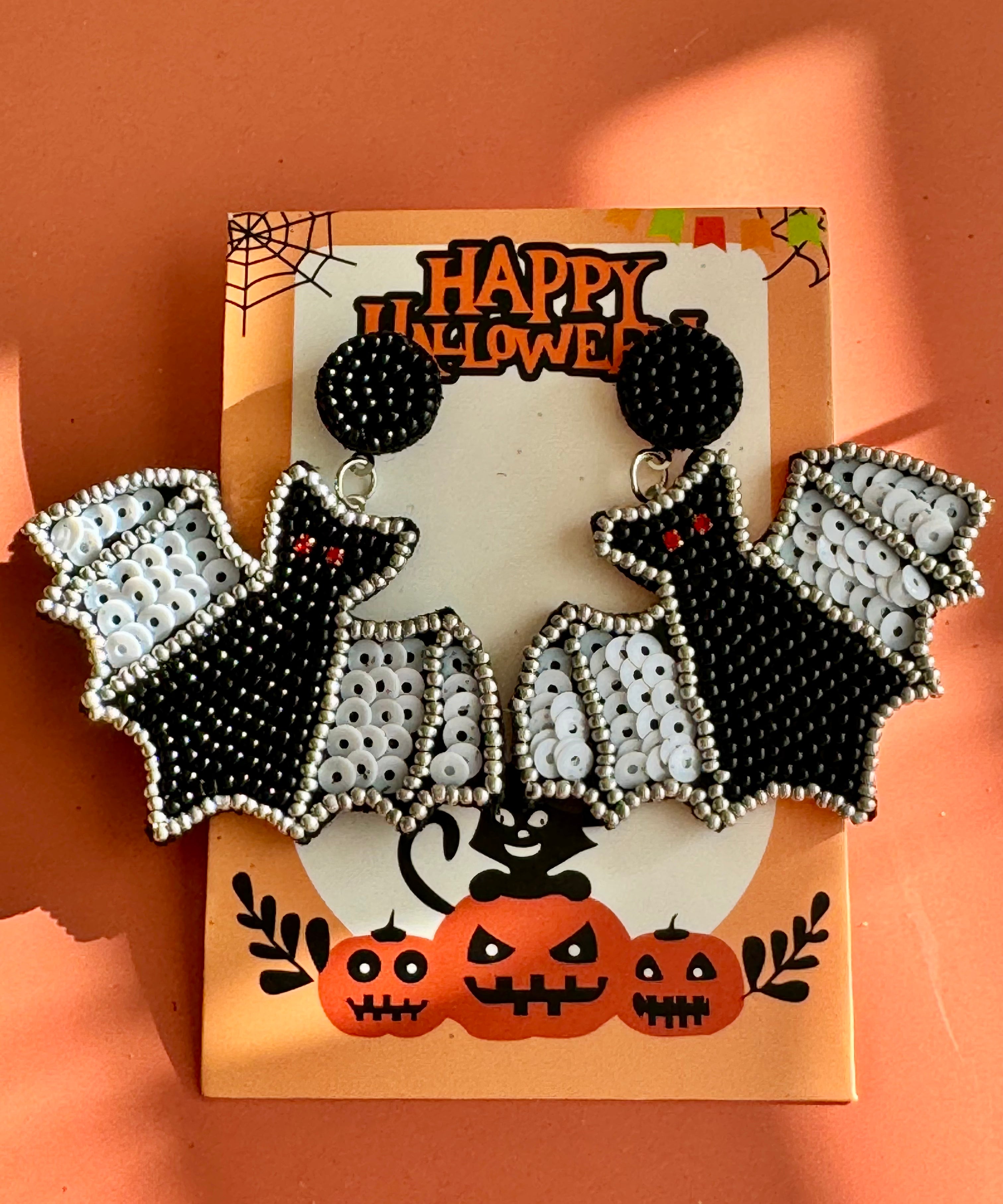 Handmade Halloween Bat Earrings: Boho Sequined Seed Bead