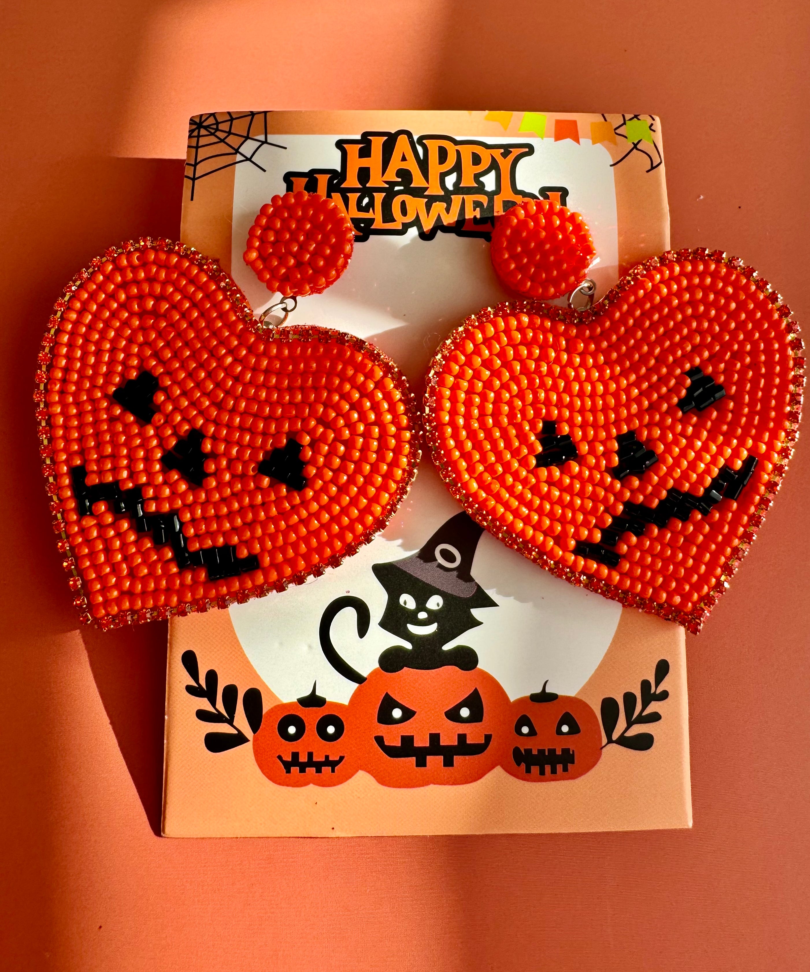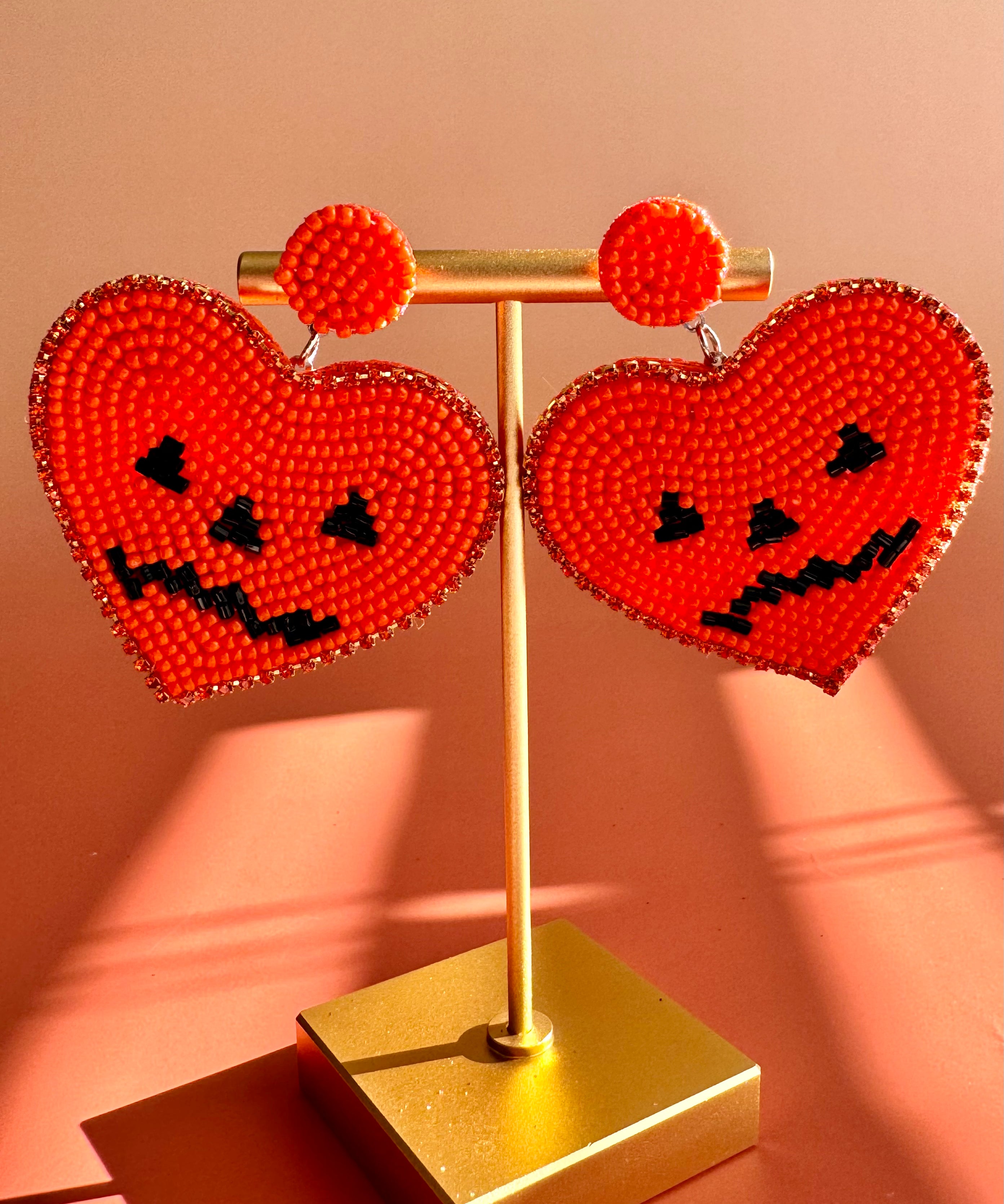 Handmade Halloween Beaded Earrings: Boho Heart Pumpkin Dangle