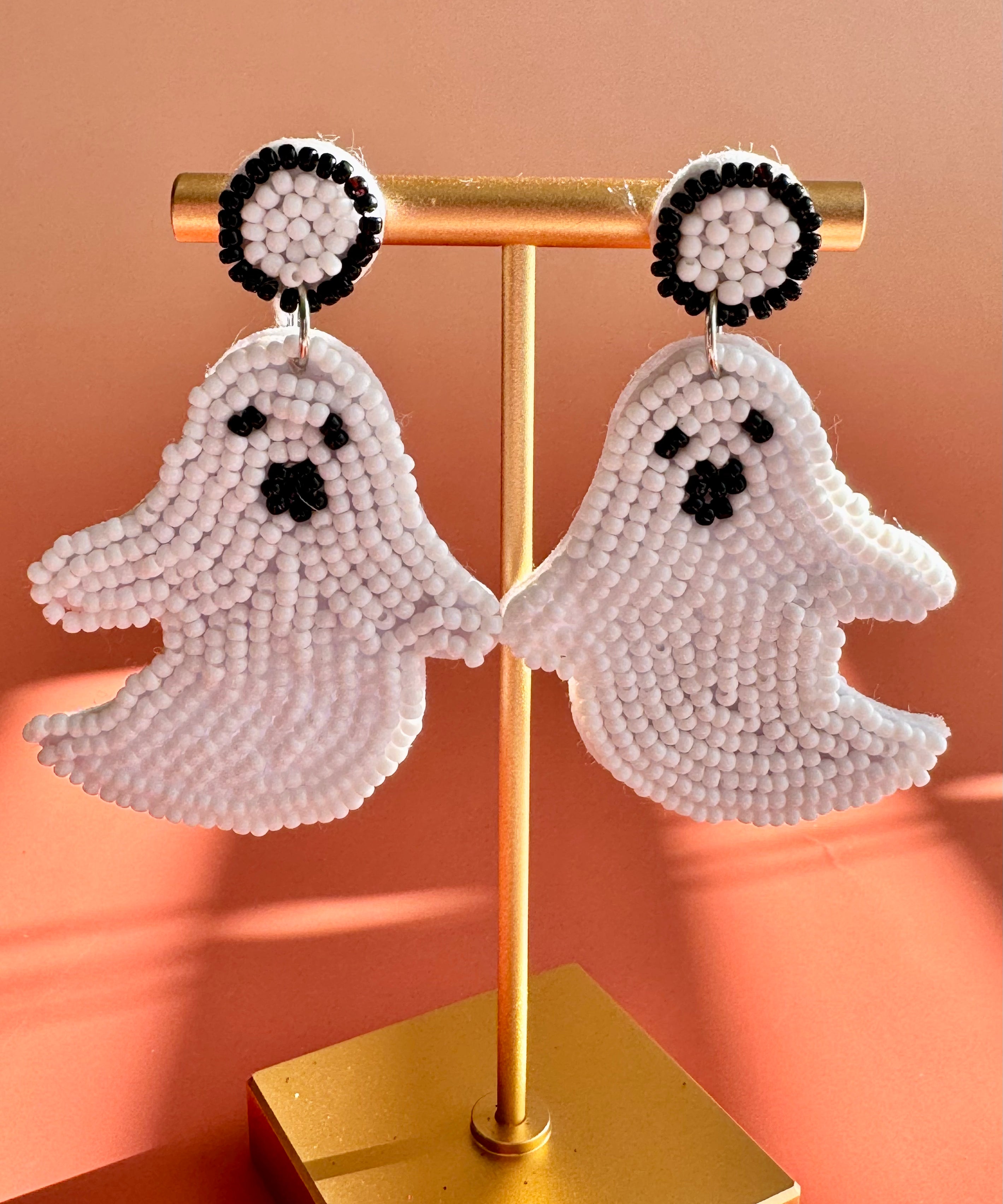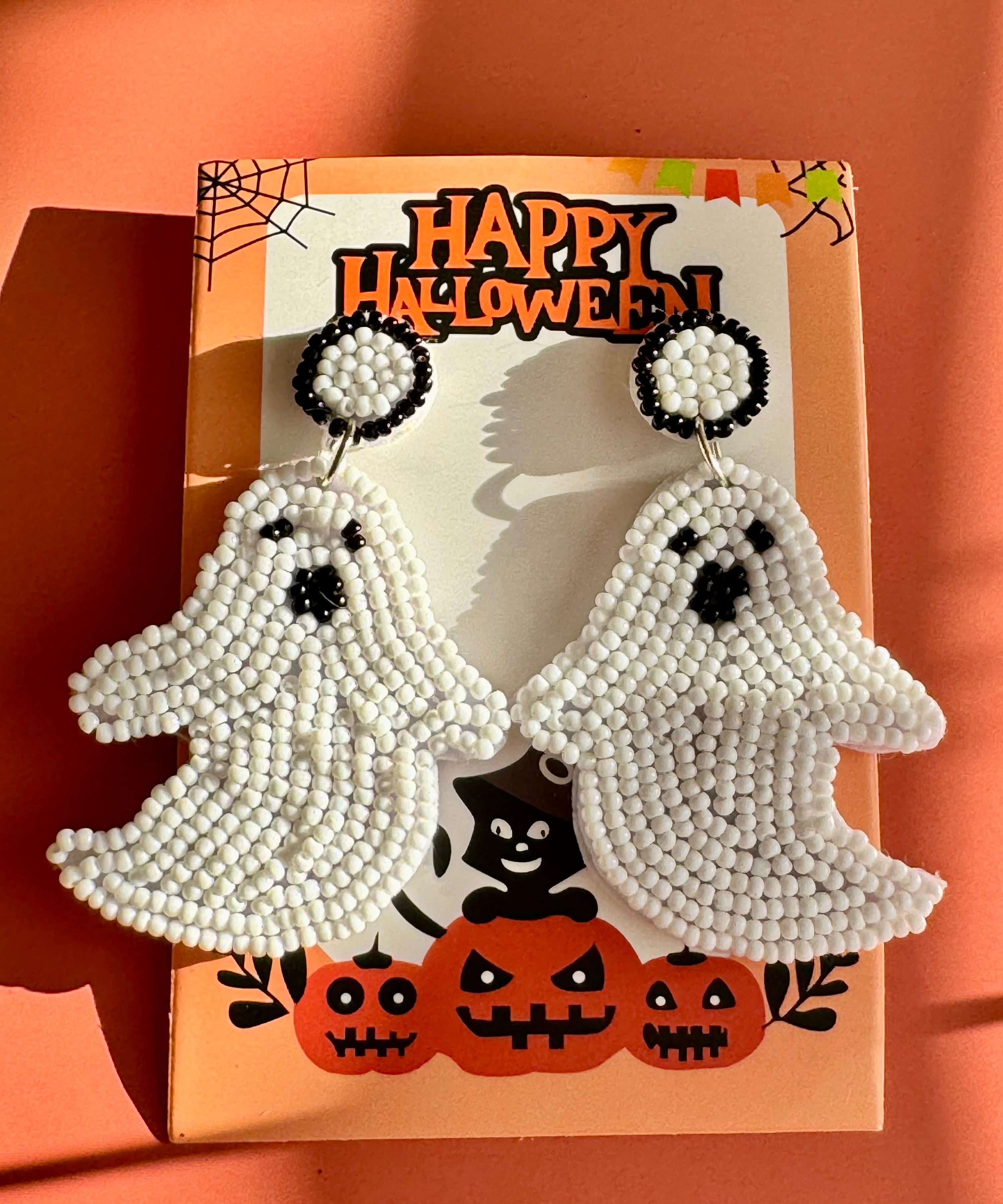 Handmade Halloween Ghost Earrings: Boho Seed Bead Dangle