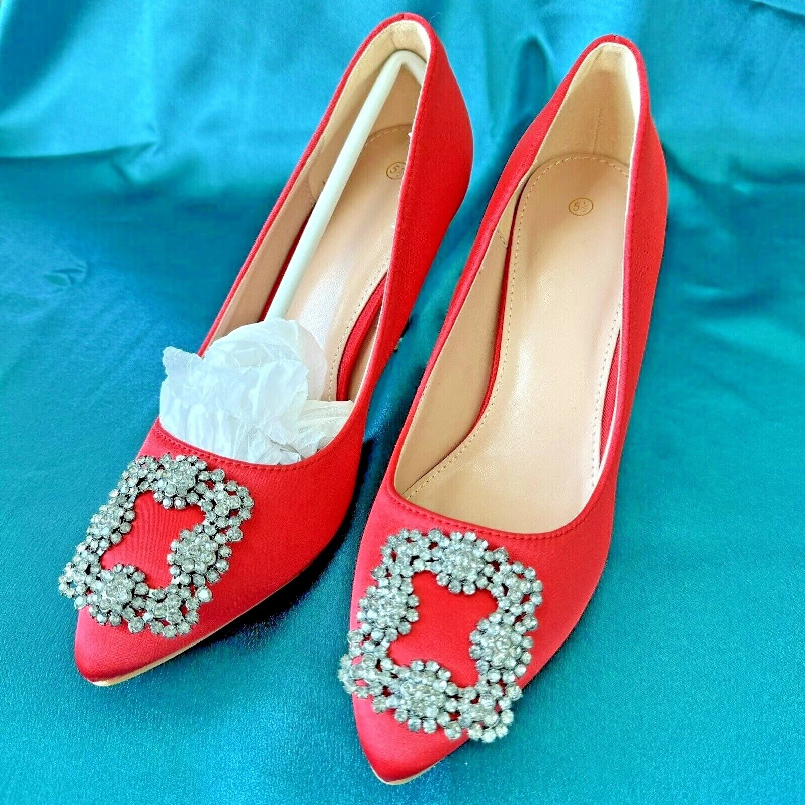 3" Hangisi RED Satin Rhinestone Crystal High Heel pumps Luxury shoe US5.5