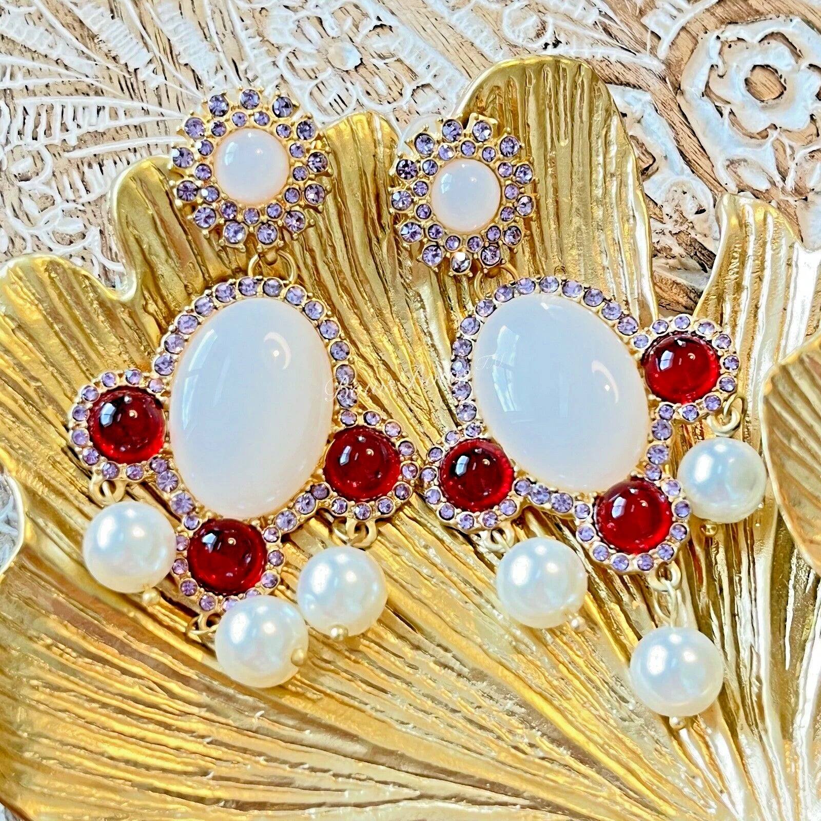 Vintage Gold Plated Resin Dangle Earring Silver Post White/Red
