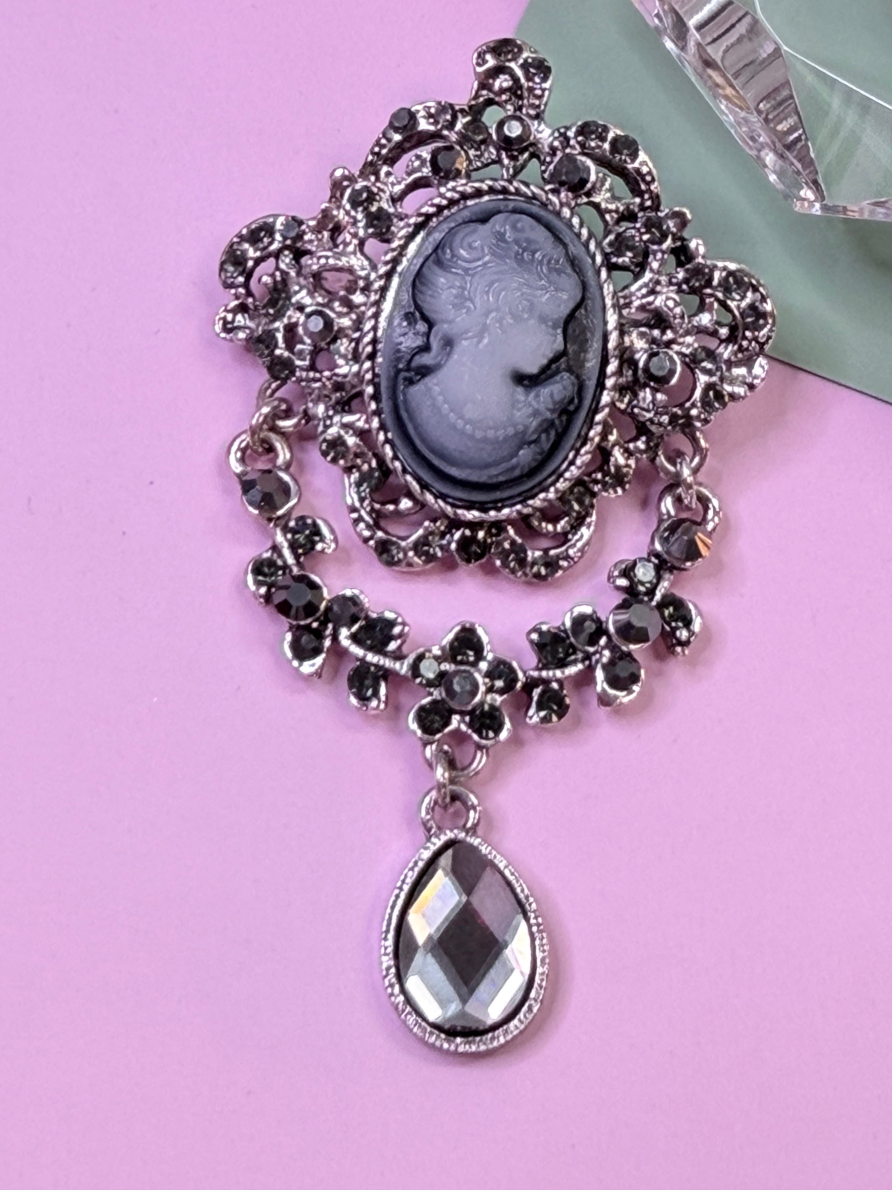 A classic cameo silhouette framed with black crystals and finished with a faceted drop pendant