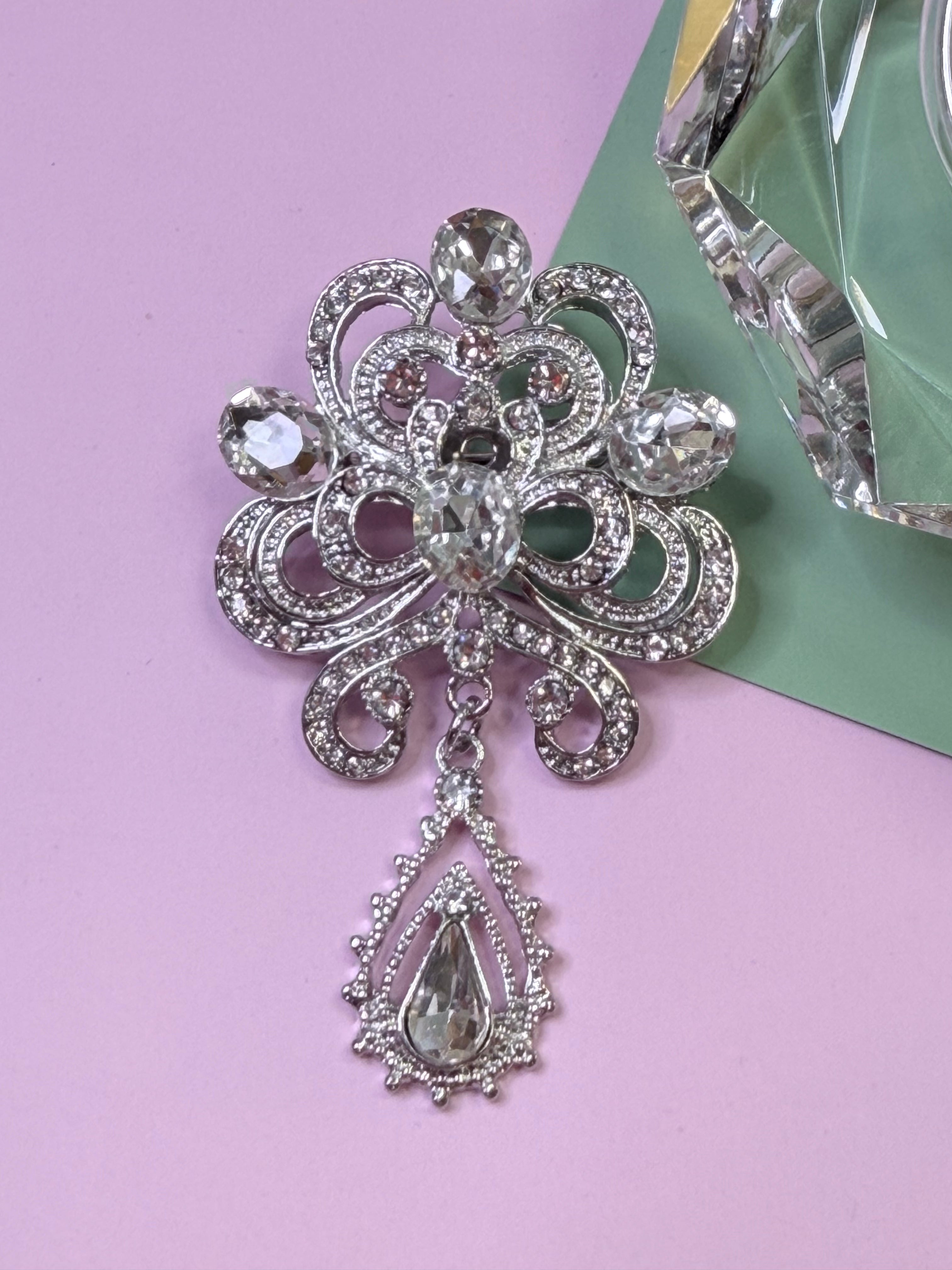 Intricate vintage scrollwork adorned with sparkling crystals and a delicate teardrop pendant